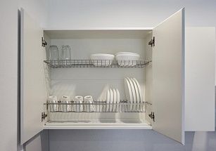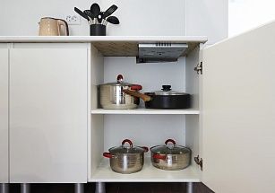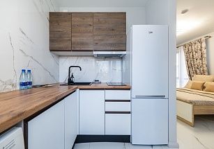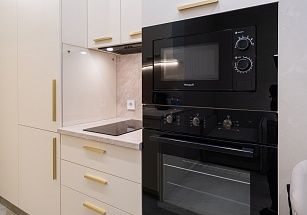 кухней, на которой имеются холодильник, плита, микроволновка, посуда;